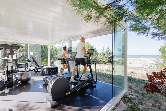 Eine Open-Air-Fitness-Oase: modernste Geräte, zu öffnende Fenster und ein Schiebedach mit dem einzigen Blick auf das Meer.